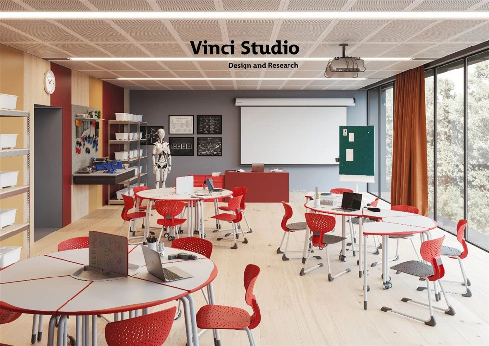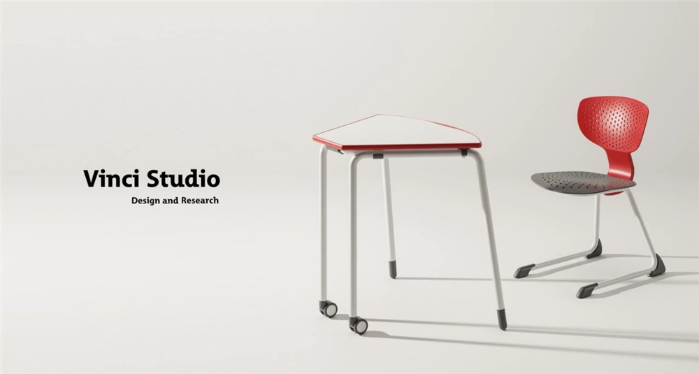 在本次設計調研中,Vinci studio發現現有的課桌椅多為矩形形式,并且由于課桌的尖角設計,學生課后嬉戲發生碰撞受傷的事件時有發生。對此,Vinci studio 作出改進,以曲線造型為主要形態,以圓弧的形式設計整套課桌椅。無論是課桌桌面或是支撐結構,都做出了圓弧處理,或者包角設計,以降低學生危險事件的概率。同時以圓弧的造型,營造一種溫和,愉快的氛圍,通過第一步的造型定義為學生提供輕松愉快使用環境。