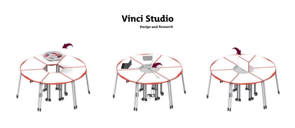 通過觀察學生的學習過程,對學生用戶的學習行為進行分析,Vinci Studio 同時也為這套課桌配套附加的輔助學生學習的功能設計。例如在圓桌的中央放置圓盤,學生可以放置文具或其他學習材料,既可以實現桌面的合理規劃,又可以共享文具,形成良好的團隊協作與分享精神。
