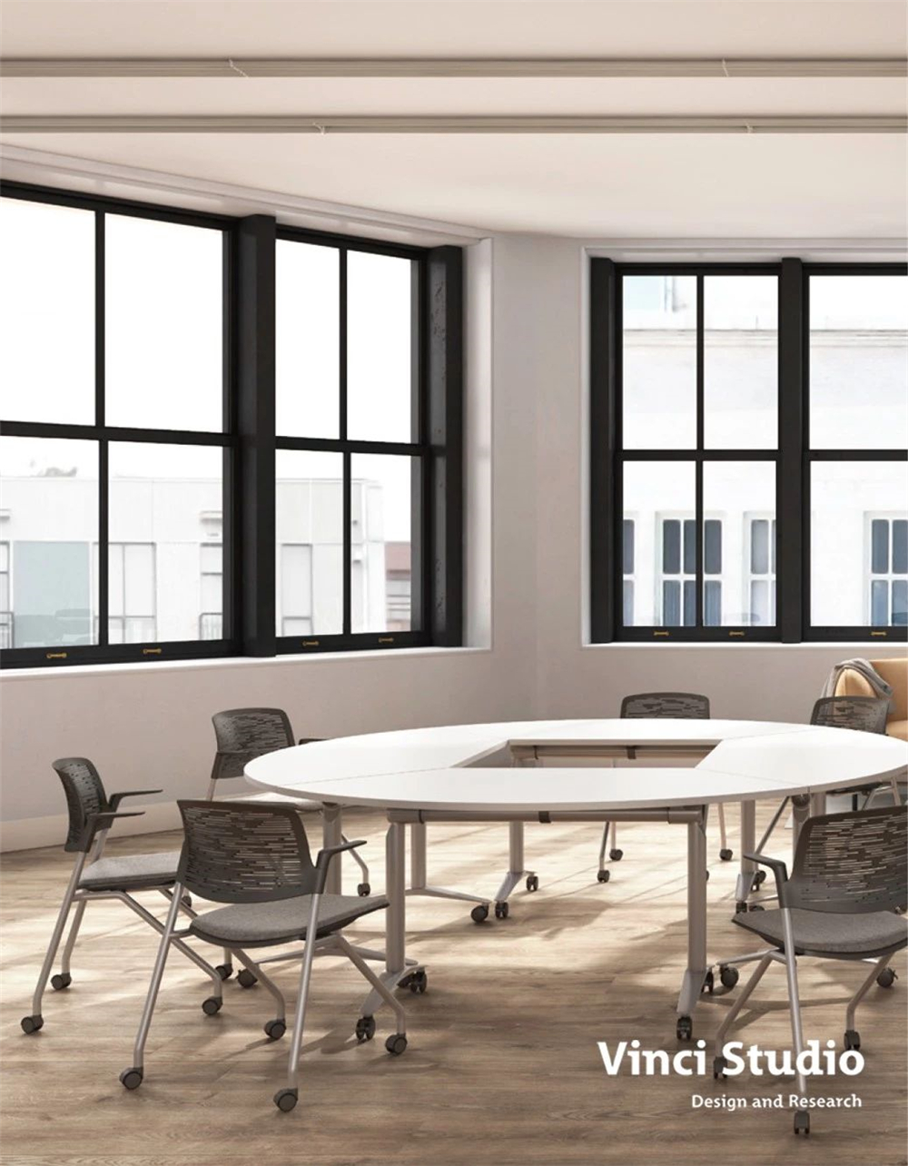 VEB桌椅以合理利用空間為設(shè)計(jì)要素。通過(guò)市場(chǎng)調(diào)研發(fā)現(xiàn),由于會(huì)議的規(guī)模大小和參與的人數(shù)不同,有時(shí)候會(huì)出現(xiàn)空間和人員的不合理分配。針對(duì)用戶的痛點(diǎn)分析,可折疊易于收納的VEB桌椅應(yīng)運(yùn)而生。