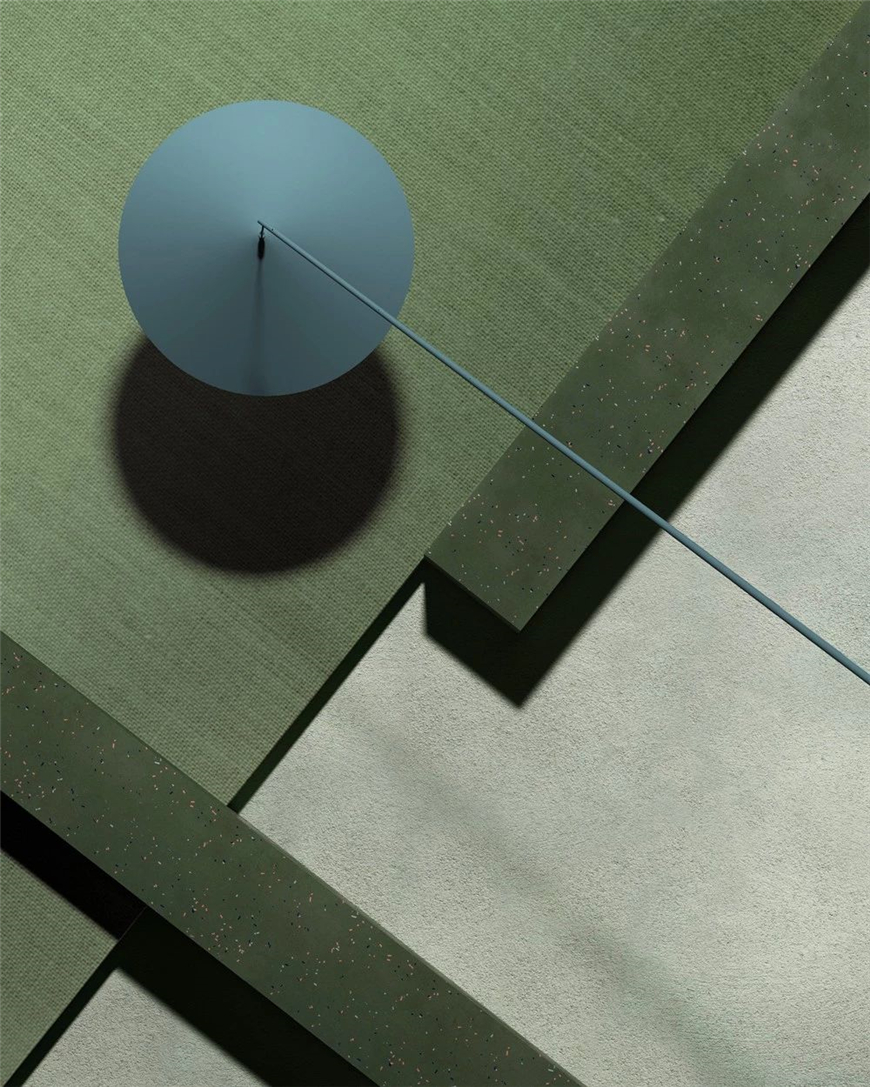 這些幾何物體覆蓋在法國跨國公司稱為iQ的乙烯基地板上,它是由木屑產生,可以回收利用。