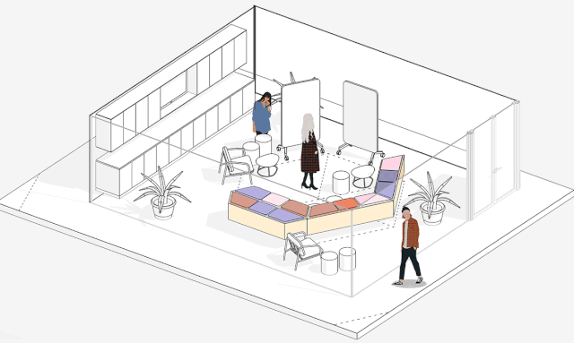 模塊化家具和滑動隔斷,能夠有效地劃分區域起到“物理隔離”的作用。而一旦疫情消失,亦可改變布局,滿足業務發展的需求。
