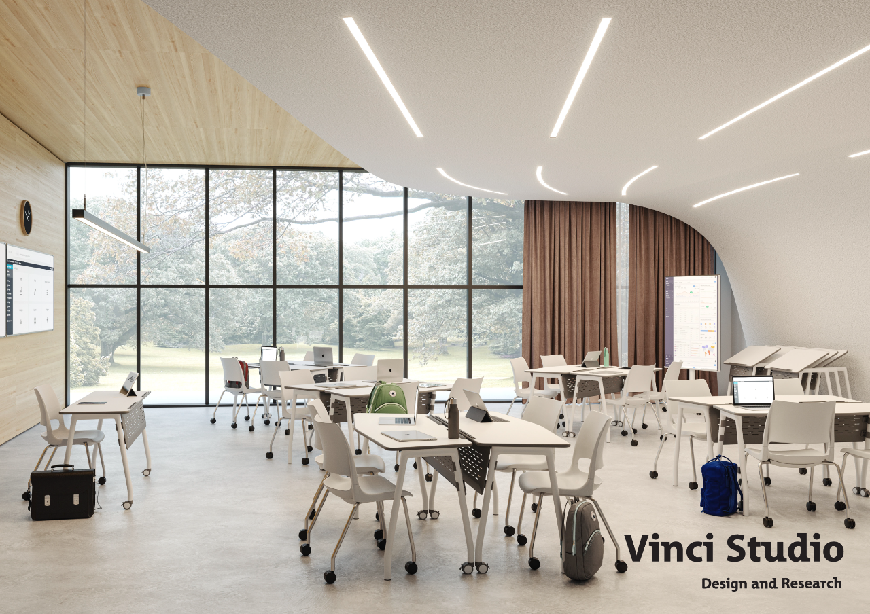 根據(jù)市場(chǎng)調(diào)查和未來教育市場(chǎng)的趨勢(shì),我們認(rèn)為,在未來的教育空間里,科技是和自然相交融的。因此我們?cè)诮淌覙?gòu)造中,采用了有機(jī)的墻體造型和大量的線性燈光設(shè)計(jì),與自然木材形成人性化的技術(shù)美。在教室中,我們也加入了智能交互白板、移動(dòng)智能白板、智能平板、智控窗簾等一系列智慧教學(xué)設(shè)備。這些設(shè)備同Turing折疊桌一起,構(gòu)成我們心目中理想的教學(xué)環(huán)境。