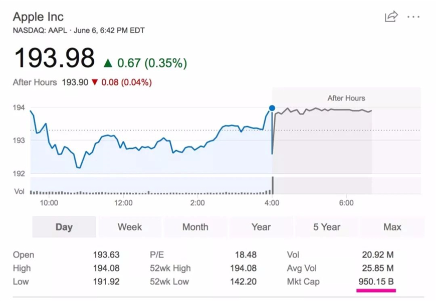 2018年6月6日,AAPL站上了9501.5 億美元的歷史高位