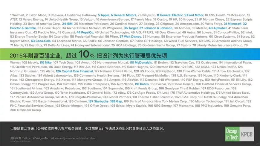 2016 年 3 月,硅谷投資機構(gòu) KPCB 發(fā)布了由前 MIT 媒體實驗室副主任、羅德島設(shè)計學院院長 John Manda 帶領(lǐng)團隊所做的研究報告《科技中的設(shè)計 2016 》。其中,對 2015 年美國“財富百強”企業(yè)調(diào)研中,有超過 10% 的企業(yè)“把設(shè)計列為執(zhí)行管理層優(yōu)先項”。這些企業(yè)中諸如蘋果、通用汽車、通用電氣、福特汽車、 IBM 、微軟、塔吉特、強生、谷歌、迪士尼、百事可樂、耐克、星巴克、 GAP 等,都是被全球市場與消費者熟知的著名品牌,意味著這些企業(yè)從董事會到頂層管理團隊,均已把設(shè)計置于決策的中心,實現(xiàn)了向設(shè)計驅(qū)動式企業(yè)及品牌的轉(zhuǎn)型。
