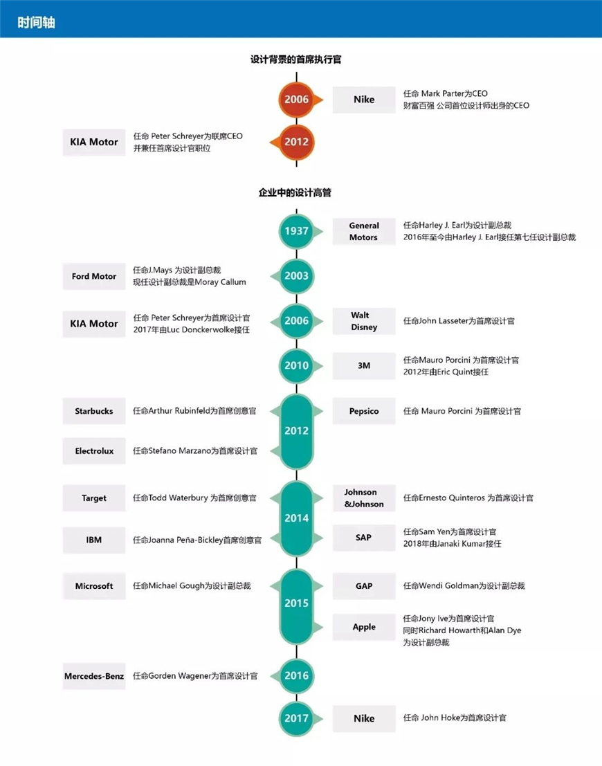 從圖中,我們可以清晰看到美國財富百強中那些“把設(shè)計列為執(zhí)行管理層優(yōu)先項”的企業(yè)中,均已在頂層高管設(shè)有CDO、CCO(首席創(chuàng)意官)與VP,而伊萊克斯、奔馳、現(xiàn)代等歐、亞企業(yè)也紛紛跟進這一變革, 表明全球創(chuàng)新與品牌建設(shè)活動正由市場驅(qū)動轉(zhuǎn)向一個設(shè)計驅(qū)動、由設(shè)計、科技與商業(yè)共同分享領(lǐng)導力的新世界。